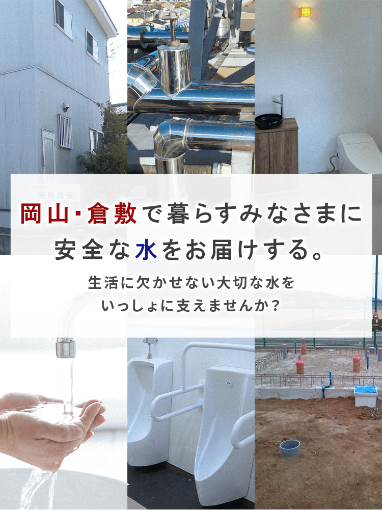 有限会社菅野設備は、暮らしのなかで毎日使用する水回りの環境を、配管工事や水道工事を通して支える岡山・倉敷の会社です。生活に欠かせない水回りを支える、重要でやりがいのある仕事に興味はありませんか?設備工事の求人をお探しの方のご応募、お待ちしております。